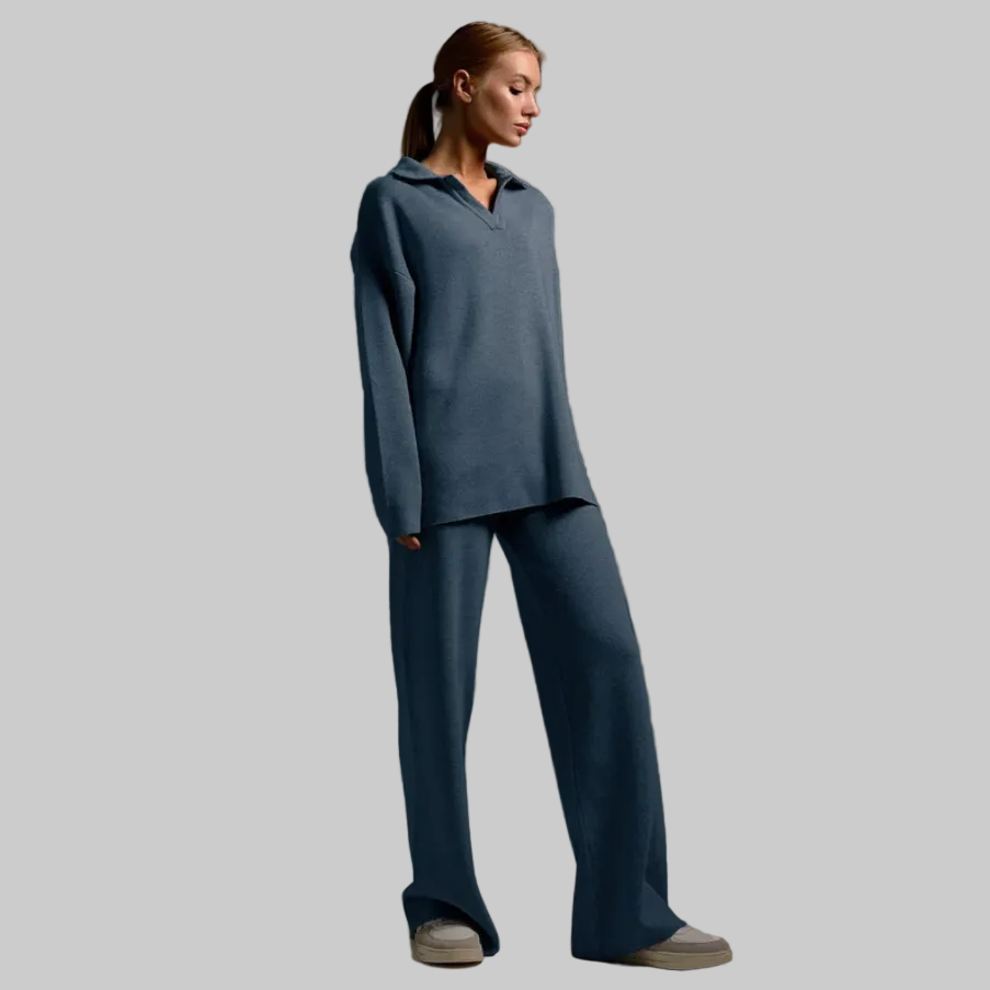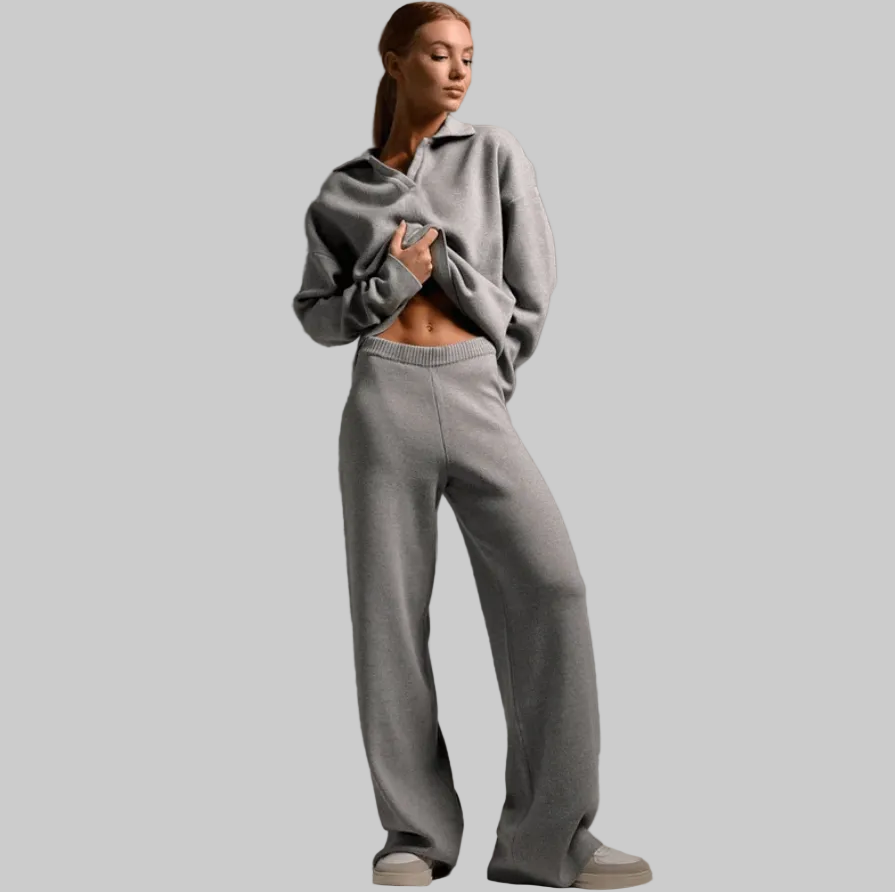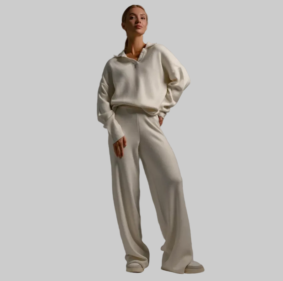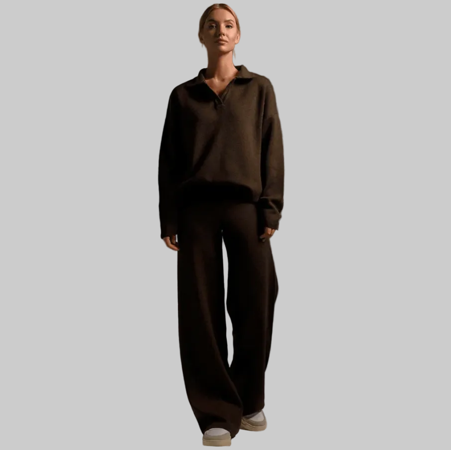 Pozvedněte svůj šatník s touto soupravou z měkké pleteniny s dokonalým střihem. Skládá se z pulovru s jemným límcem a kalhot s širokými nohavicemi, nabízí minimalistický a moderní vzhled, který snadno přechází z pohodlí domova do elegantního městského Styl. Neutrální barva a nadčasový design zaručují maximální všestrannost, zatímco příjemný materiál poskytuje pohodlí po celý den.