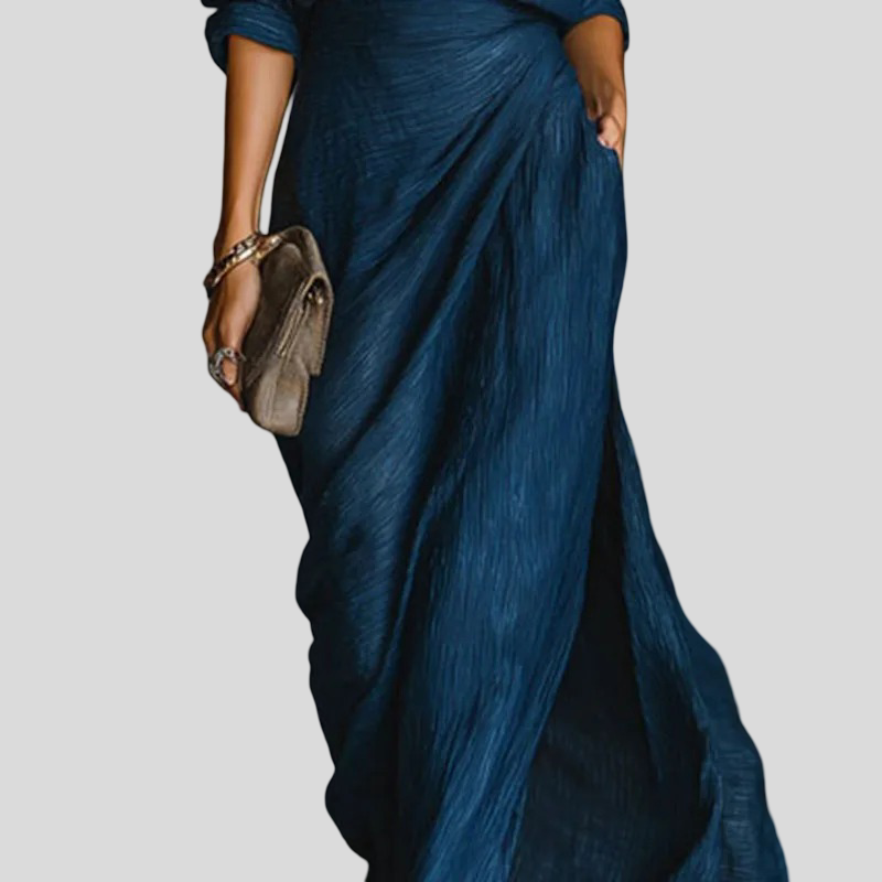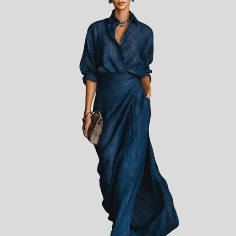 Tato souprava obsahuje blůzu s knoflíky vpředu, vyhrnutými rukávy a měkkým volným límcem. V kombinaci s vysokou maxi sukní přizpůsobenou v pase, kousek nabízí plynulou siluetu zvýrazněnou jemnými sklady a decentním předním rozparkem. Lehká a nařasená textura dodává rozměr a lehkost, což činí tuto soupravu ideální pro sofistikované příležitostné akce nebo noční události.