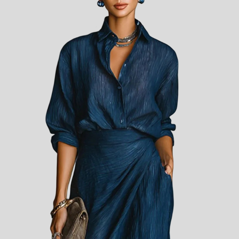 Uvolněná elegance: Blůza s jedinečným střihem a nařasená sukně vytvářejí elegantní a uvolněnou siluetu, s ideální dávkou sofistikovanosti.