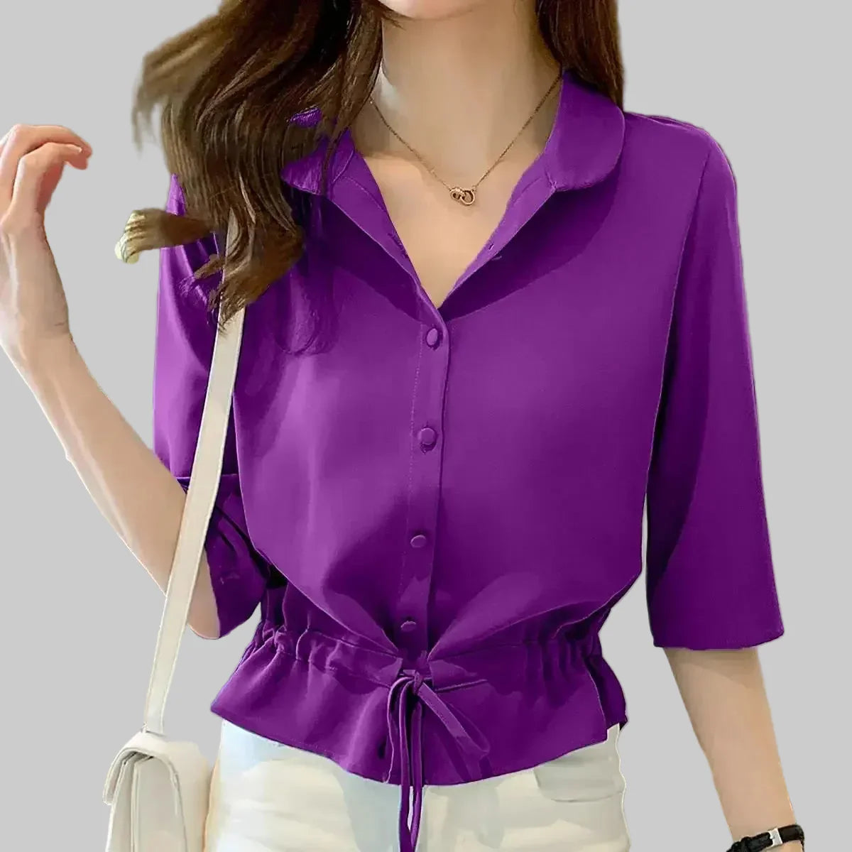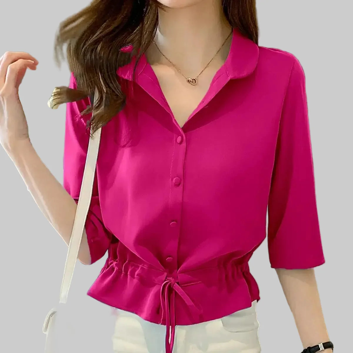Tato blůza s výrazným pasem dodává vašemu vzhledu ženskou siluetu, aniž byste museli obětovat pohodlí. Klasický límec košile, krátké rukávy a přední zapínání na knoflíky ji činí univerzálním kouskem pro kancelář, krátké výlety nebo neformální večerní vycházky. Nastavitelný šňůrkový pas zajišťuje dokonalé padnutí a elegantní siluetu.