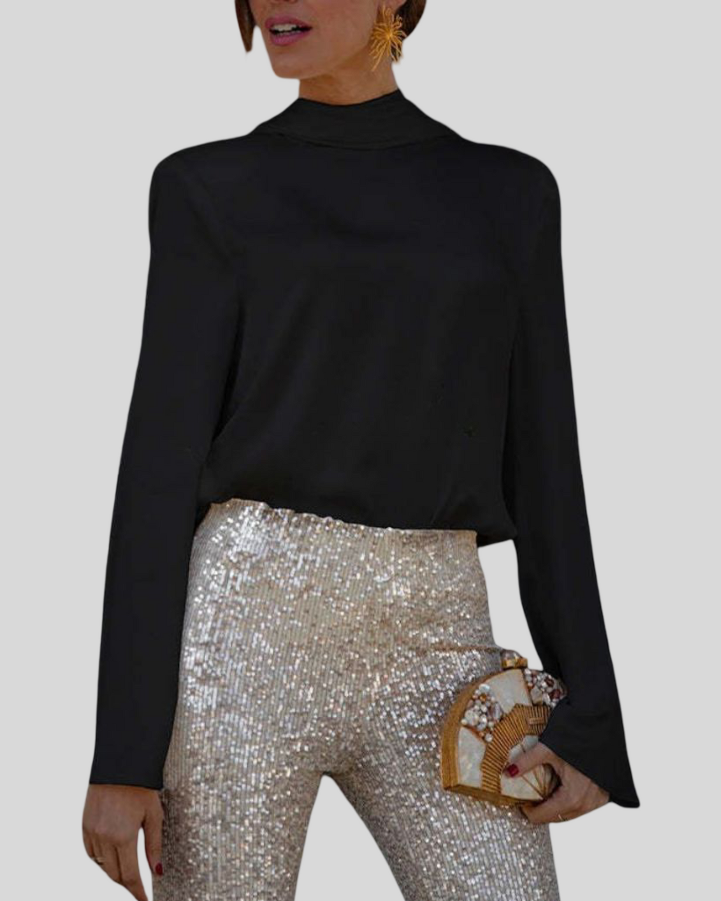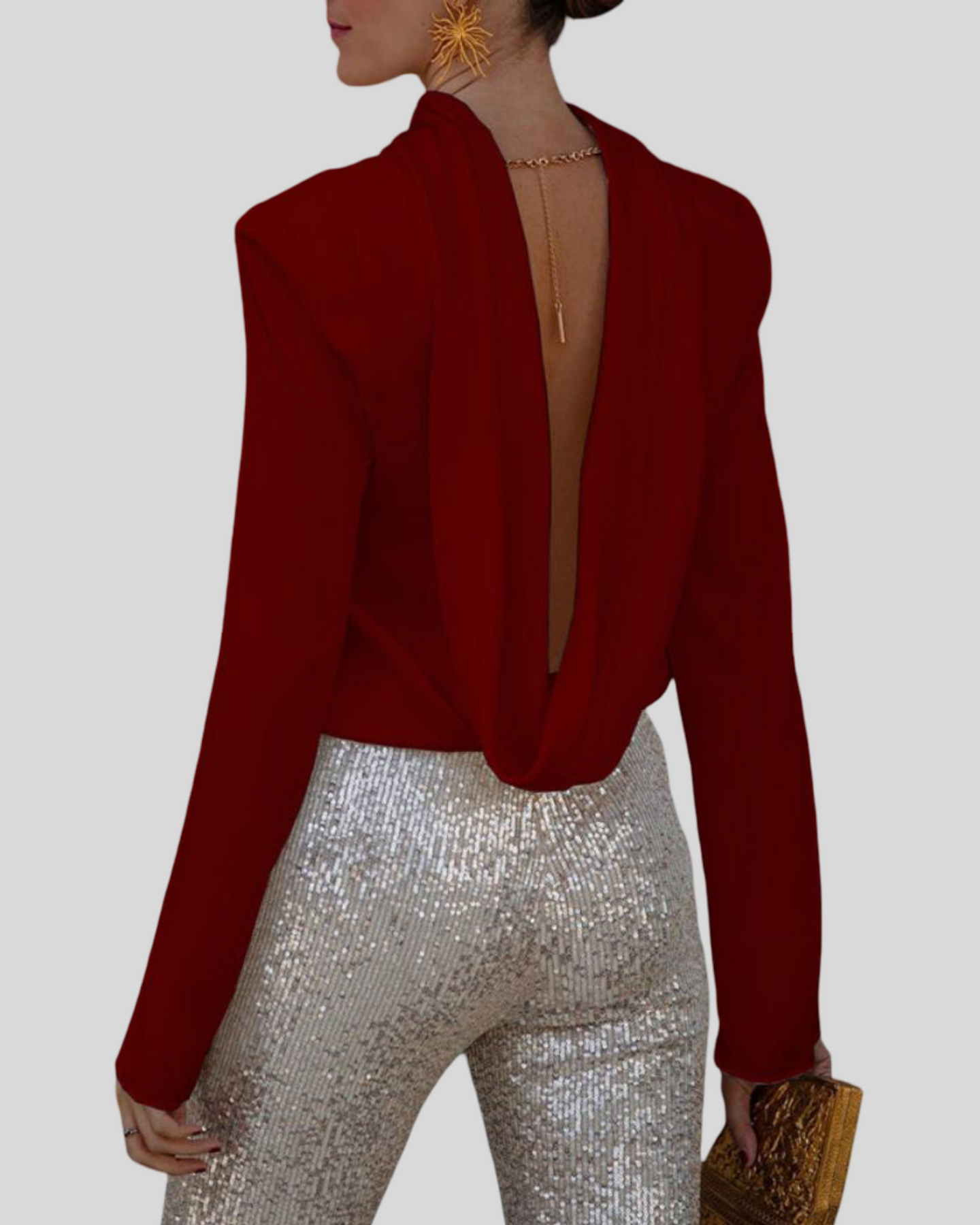 Tato elegantní blůza s dlouhými rukávy posouvá noční glamour na novou úroveň. Přední část zůstává jednoduchá a rafinovaná, zatímco hluboká drapérie na zádech přitahuje všechny pohledy. Tekoucí látka zvýrazňuje siluetu, aniž by omezovala pohyb – ideální pro slavnostní akce, romantické večeře nebo elegantní noci.