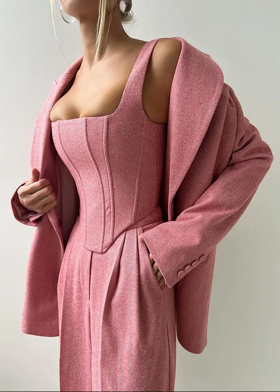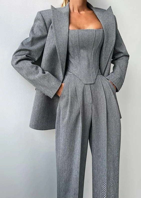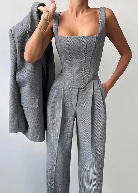 Tato souprava spojuje sofistikovanost a modernost v bezchybné siluetě. Strukturované krejčovství zvýrazňuje postavu přesnými liniemi a ženským střihem, zatímco tkaniny s jemnou texturou zajišťují pohodlí a přítomnost. Blazer s páskem zvýrazňuje pas a vyzařuje moc a eleganci, zatímco verze s bezrukávem dodává současný a odvážný nádech. Univerzální souprava, navržená pro sebevědomé ženy, které se chtějí s třídou vyčnívat při jakékoli příležitosti.
