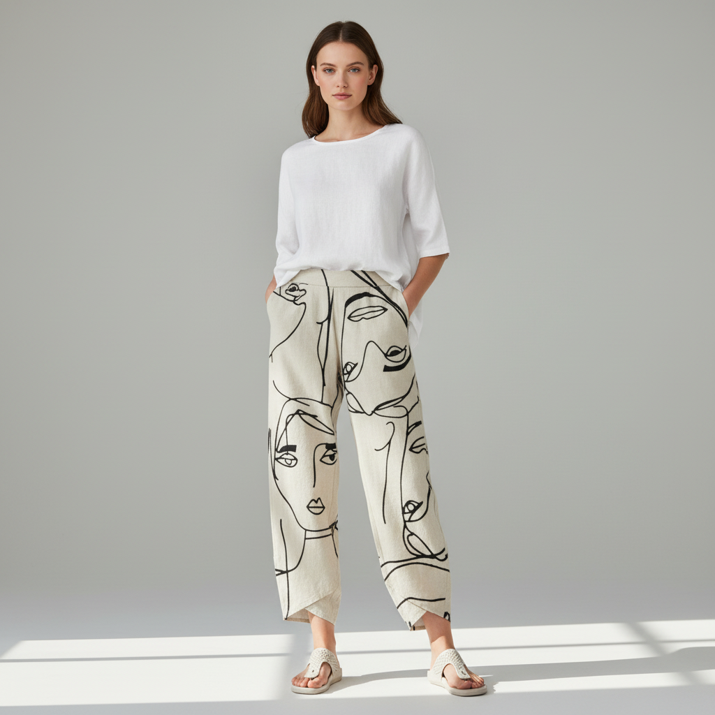 Hledáte jedinečné lněné kalhoty, které kombinují vysokou kvalitu s kreativním potiskem? Béžové lněné kalhoty Gabriela jsou tou správnou volbou! Díky svému originálnímu designu a velké variabilitě spojují eleganci a pohodlí zcela novým způsobem.