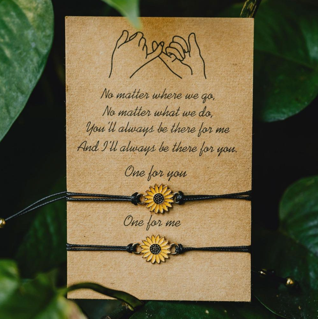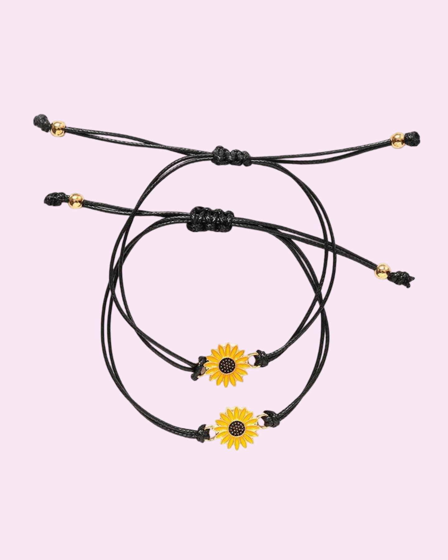 Náramky přátelství Slunečnice symbolizují radost, loajalitu a pozitivní energii. S jemnou zlatou slunečnicí a nastavitelným provázkem byl tento set vytvořen, aby reprezentoval to přátelství, které osvěcuje tvůj život, i v těch nejzamračenějších dnech. Jednoduché, plné významu a dokonalé pro sdílení s někým výjimečným, tyto náramky jsou každodenní připomínkou spojení, náklonnosti a důvěry.