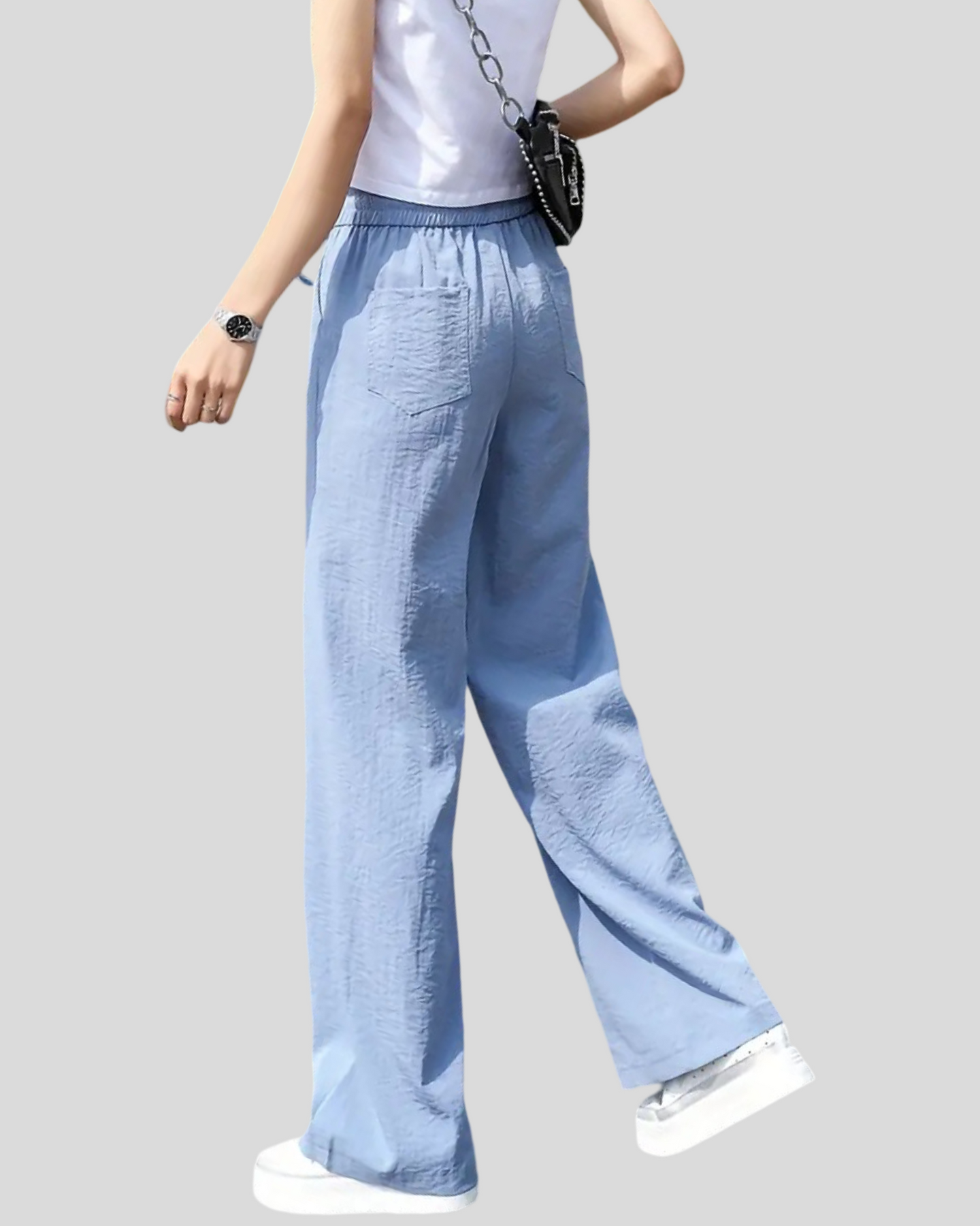 Kalhoty Stella byly navrženy pro ty, kteří hledají pohodlí bez obětování stylu. S širokým a elegantním střihem, elastickým pasem s nastavitelnou šňůrkou a lehkým a prodyšným materiálem, jsou tyto kalhoty ideální pro uvolněné outfity nebo sofistikovanější kombinace. Světle modrá barva vyzařuje svěžest a všestrannost, ideální pro všechna roční období, zejména na jaro a léto.