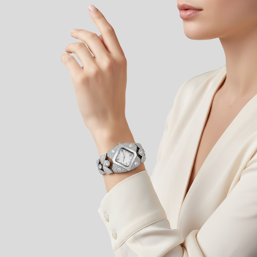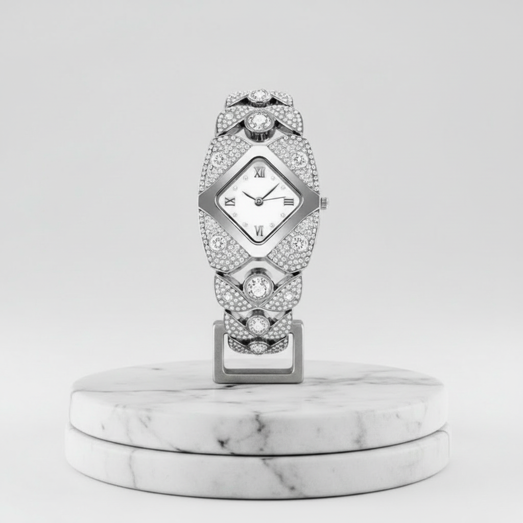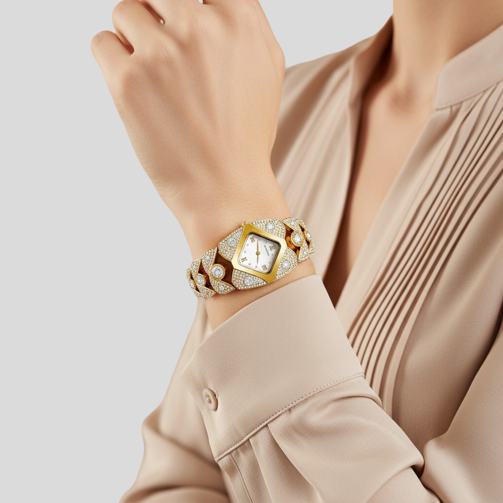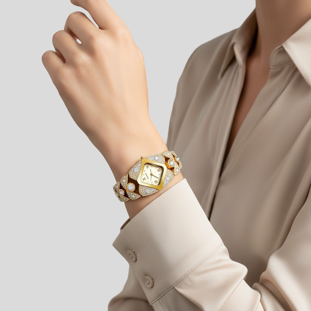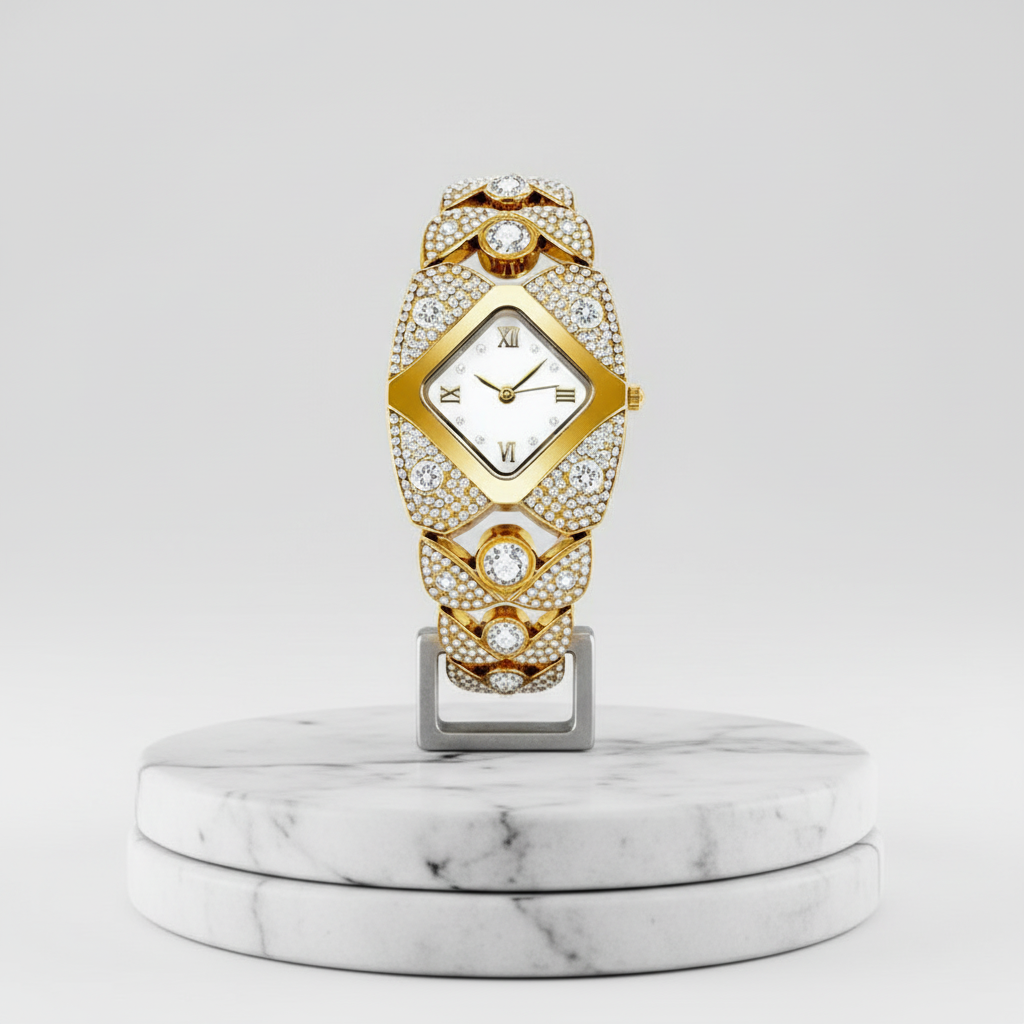 Tyto hodinky jsou dokonalou definicí sofistikovanosti a glamouru. S jemným zlatým povrchem, detaily posázenými třpytivými krystaly a elegantním čtvercovým ciferníkem byly navrženy pro ženy, které chtějí vyzdvihnout svůj styl s třídou. Ideální pro zvláštní příležitosti nebo pro pozvednutí jakéhokoli každodenního vzhledu, tyto hodinky promění čas na skutečný luxusní doplněk.