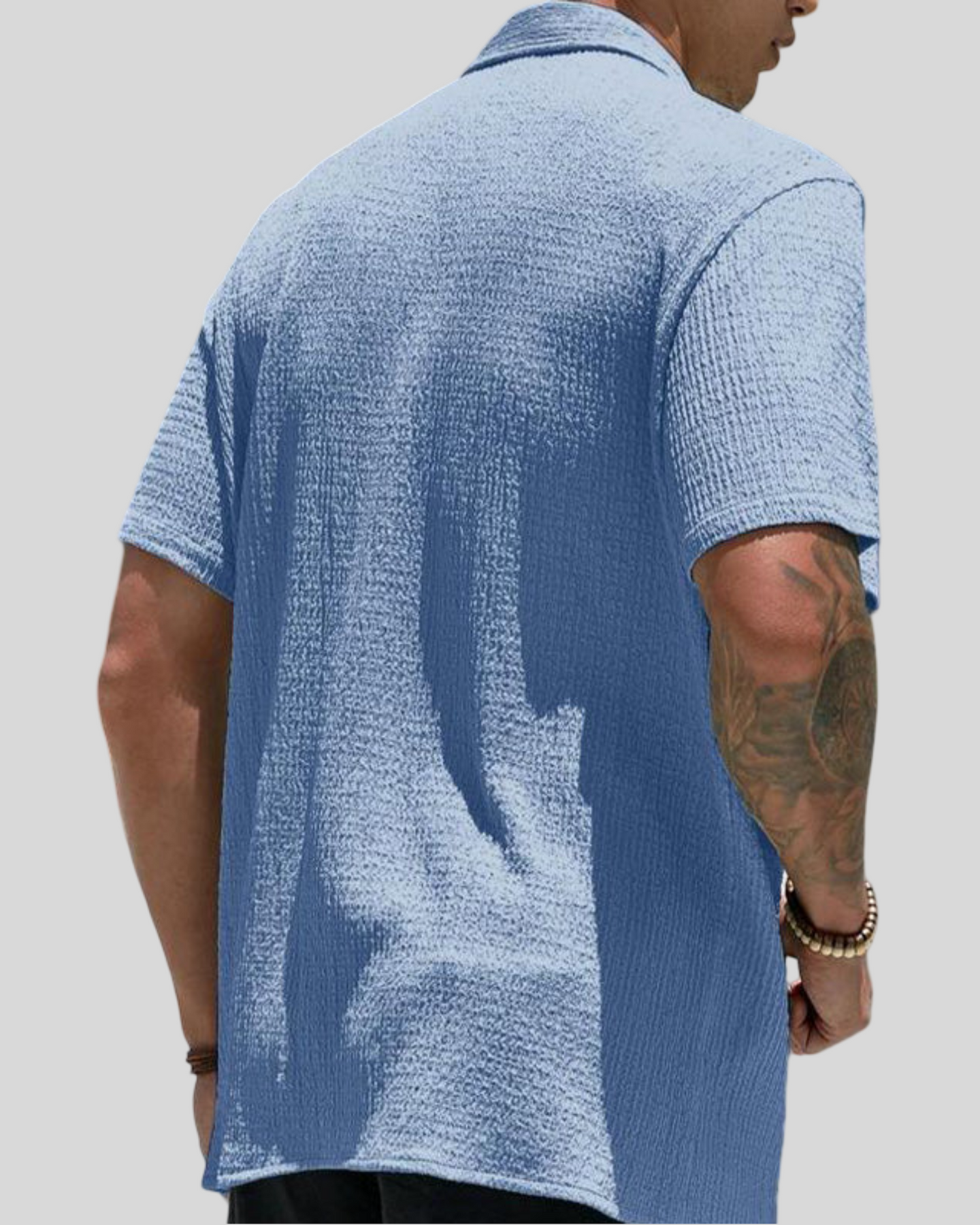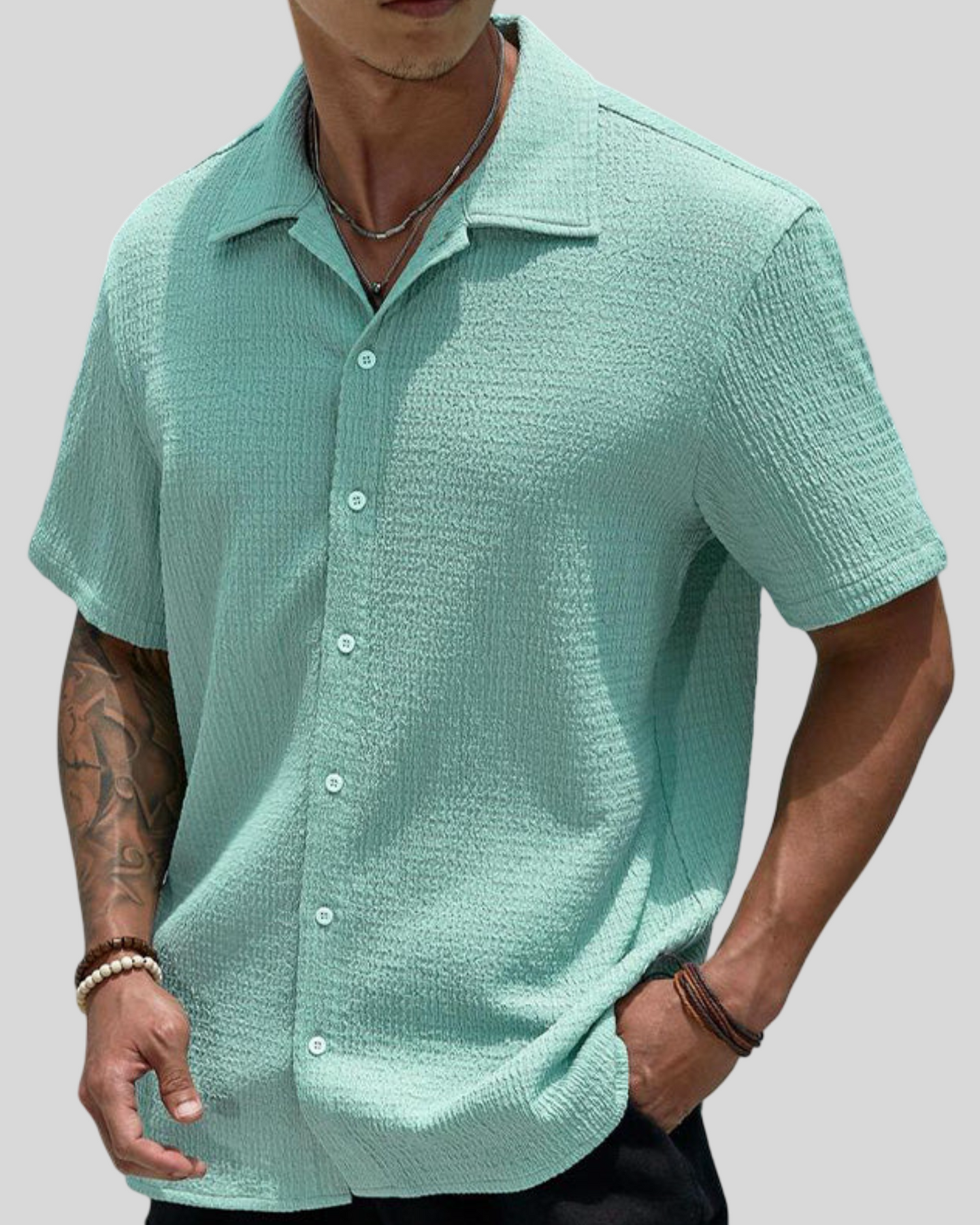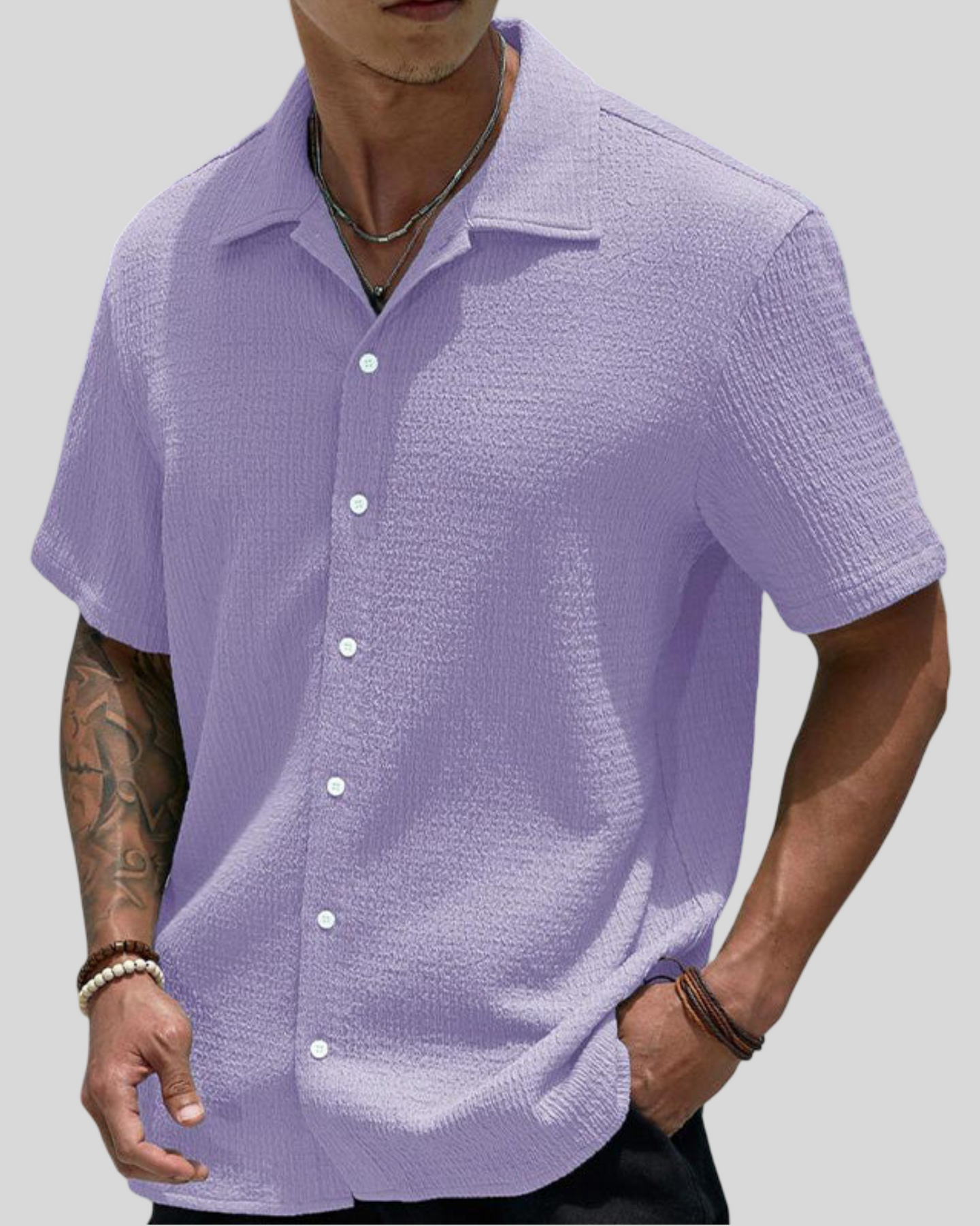 Pánská košile s krátkým rukávem z texturované látky (efekt vafle/krépu), super lehká a prodyšná, ideální na horké dny. Má otevřený resortní límec, přední knoflíky a uvolněný střih, který vypadá dobře jak na ven, tak uvnitř kalhot. K dispozici v svěžích barvách jako bílá, fialová, modrá a mentolová, , ideální pro moderní a čistý vzhled.