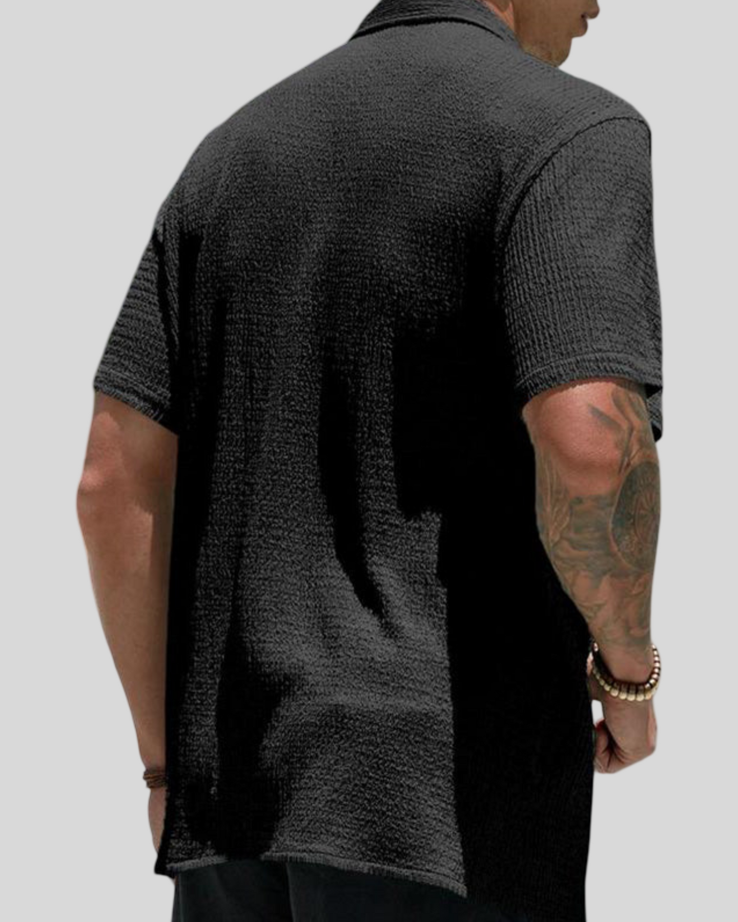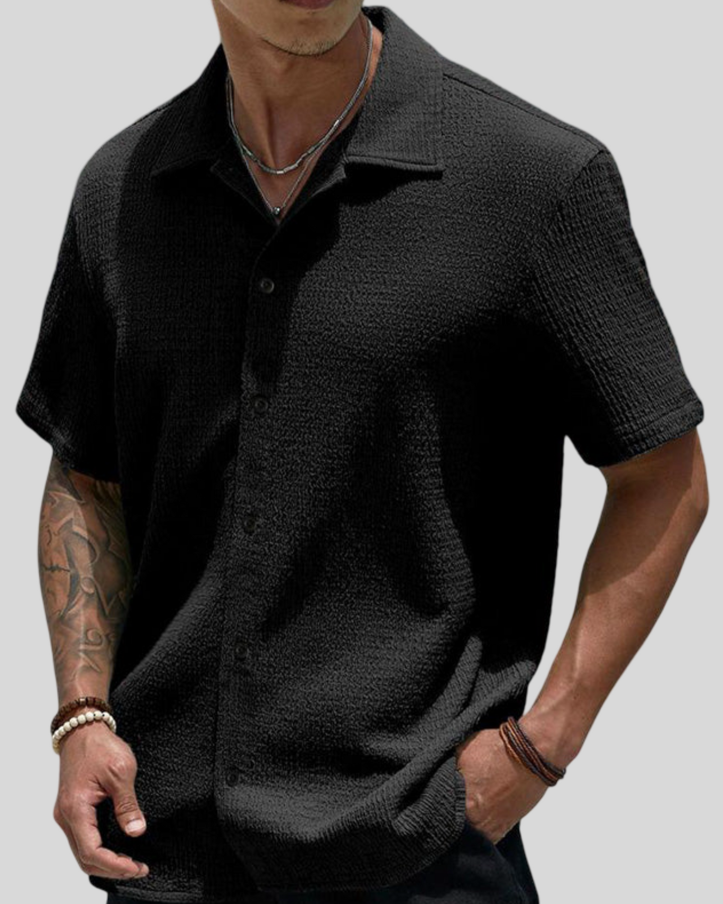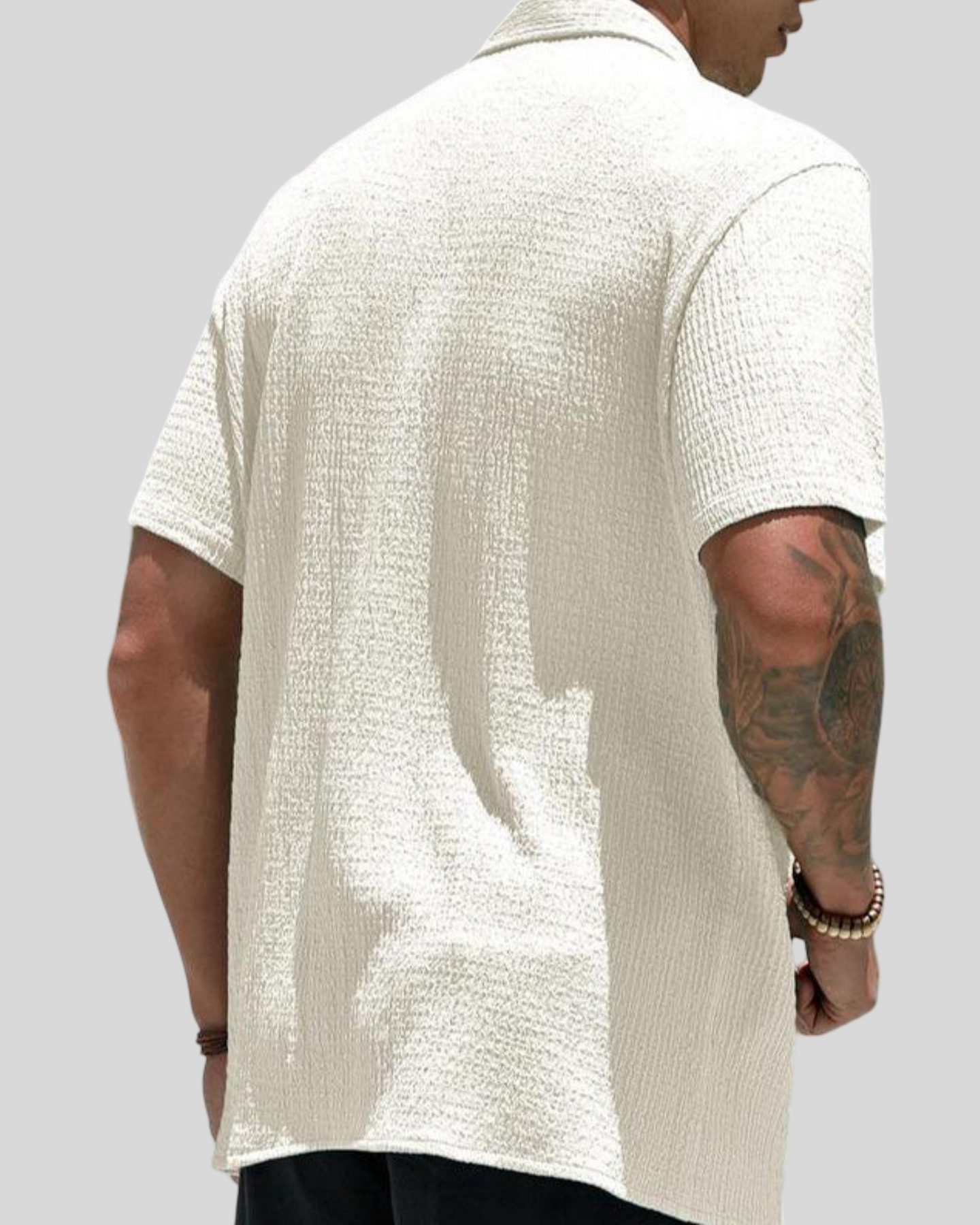 Pánská košile s krátkým rukávem z texturované látky (efekt vafle/krépu), super lehká a prodyšná, ideální na horké dny. Má otevřený resortní límec, přední knoflíky a uvolněný střih, který vypadá dobře jak na ven, tak uvnitř kalhot. K dispozici v svěžích barvách jako bílá, fialová, modrá a mentolová, , ideální pro moderní a čistý vzhled.