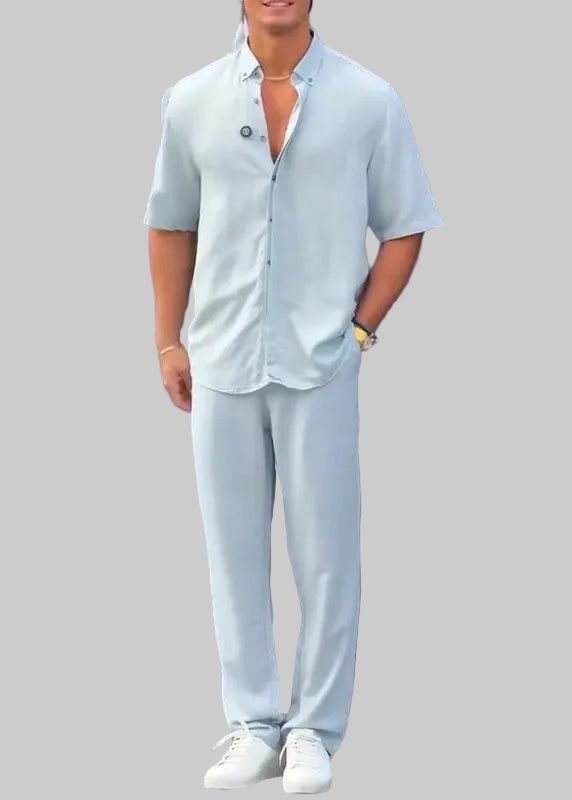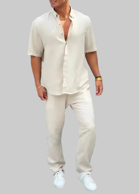 Muži, souprava s košilí s krátkým rukávem a volným střihem, ideální na horké dny. Materiál má vzhled „lenového vzhledu“ (lehký a přirozený vzhled), nabízí čistý, moderní a sofistikovaný styl. Perfektní na procházky, dovolené, večerní výlety nebo dokonce na neformální akce, kde chceš vypadat dobře bez námahy.