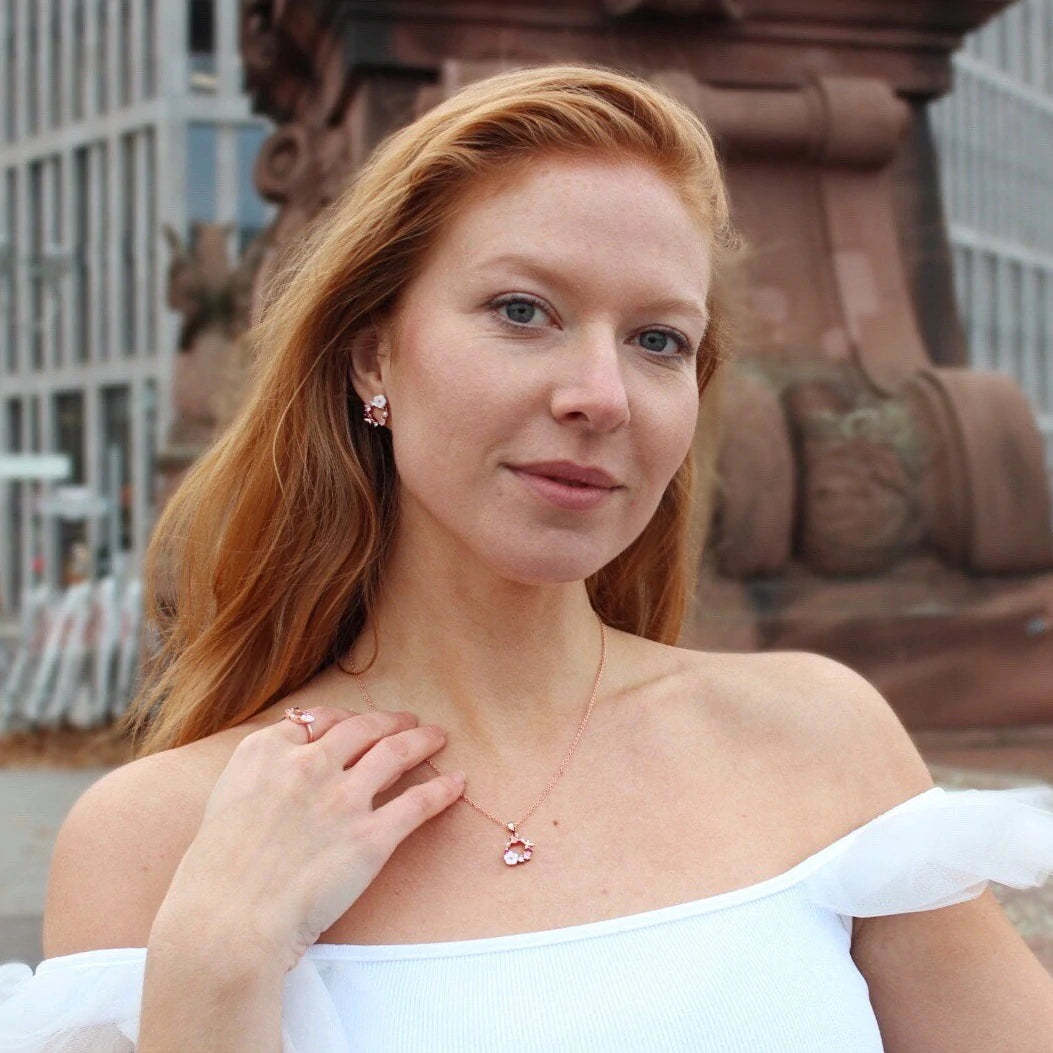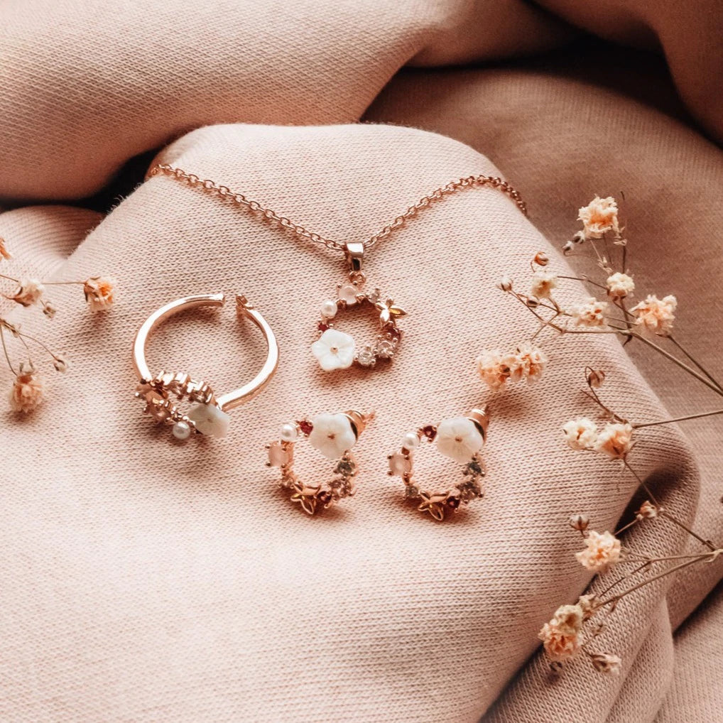 Květnový set Aurora v růžovém kombinuje jemnost růžového zlata s romantickým a sofistikovaným květinovým designem. Skládá se z náhrdelníku, náušnic a nastavitelného prstenu, tento set byl vytvořen, aby osvěžil tvůj vzhled s elegancí a ženskostí. Jemné květiny, subtilní perly a třpytivé krystaly vytvářejí dokonalou harmonii, ideální jak pro zvláštní příležitosti, tak pro zvýšení každodenních outfitů.