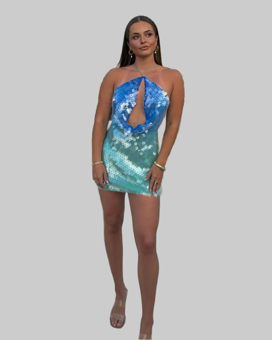Dámské krátké šaty se sofistikovaným a moderním designem, vyrobené z flitrů, které zaručují lesk a pozornost. Mají halter výstřih s uvázáním za krkem a přední výřez, elegantně zvýrazňující siluetu. Přiléhavý střih zvýrazňuje postavu, ideální pro večírky, noční akce a zvláštní příležitosti.